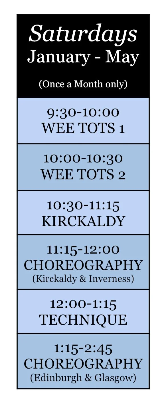 Kirkcaldy is our beginner dancers that have graduated from the Wee Tot Program. Kirckaldy classes are held once a week for 45 minutes. This class focuses on the first five dances. (Fling, Sword, Seann Truibhas, Lilt & Flora) Our instructors focus on building strong technique skills & musicality. These dancers may have the option to be competitive. For the 25/26 season Kirkcaldy will be held on Saturdays 10:30am-11:45am