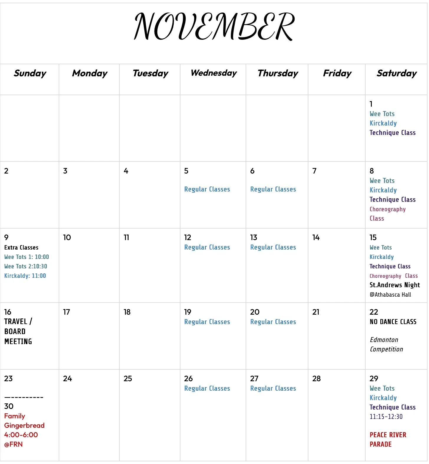 Fundraising: Each family that is a part of PRSS must participate in two club fundraiser. The two fundraisers include The Grimshaw Legion Bingo (January) & The Ferns Greenhouse Flower Basket Fundraiser. Participating in these fundraisers help our little club offset fees for studio rental and teacher wages. There will be a $200 cheque deposit, and if your family meets the requirements for these two fundraisers, they will receive their deposit back!